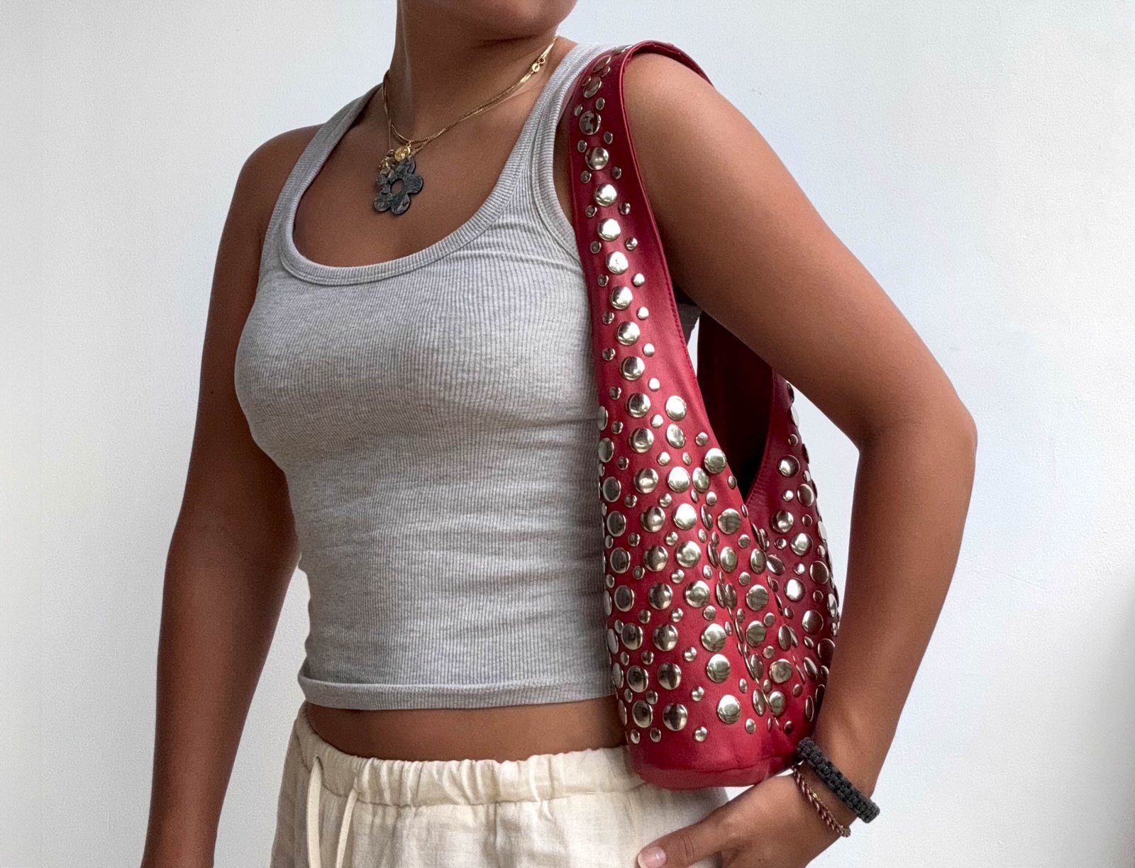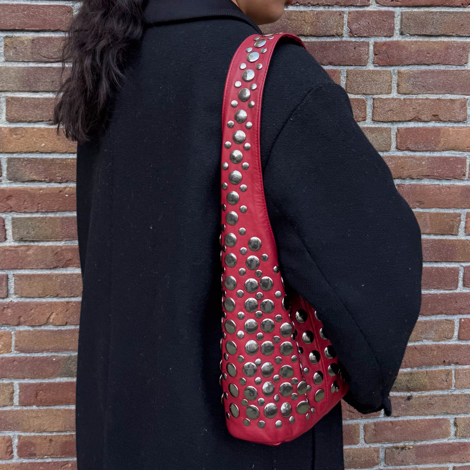 Our Rub Bag is a trendy cherry red colored bag with silver studs. This is a smaller version of the Roxy Bag. It is a statement piece to have. Wearing a basic black outfit? With the Ruby Bag your outfit won’t be basic anymore!